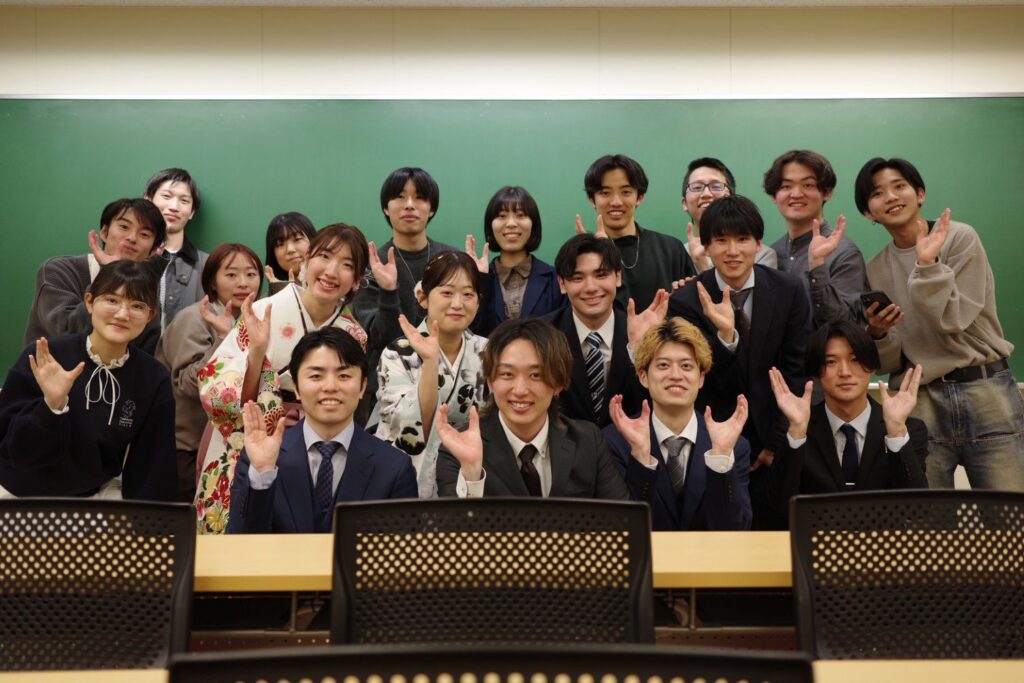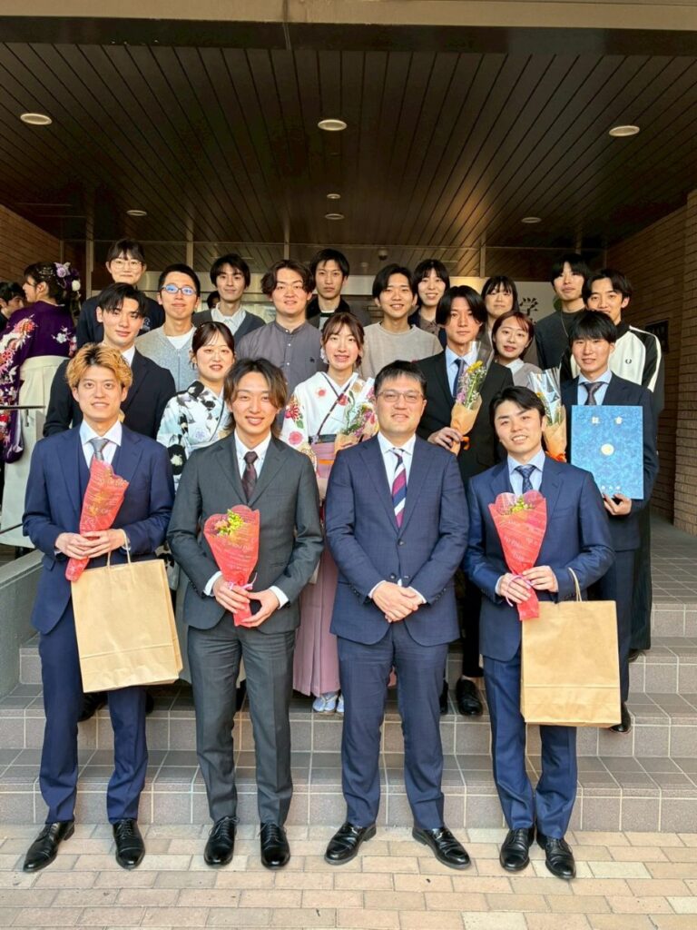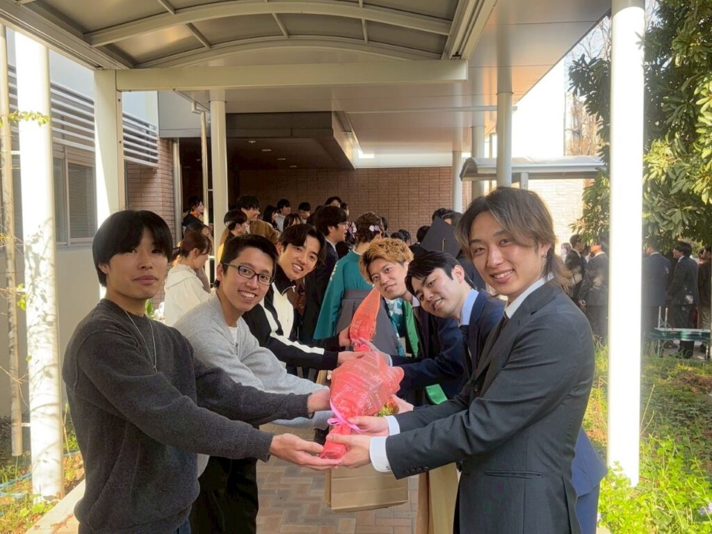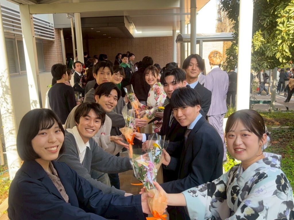 The Academic year Graduation Ceremony is held on the Kasumi campus. After the ceremony, the graduation ceremony at Uchida lab is held, such as the presentation of bouquets and albums, delivery of bound copies of theses, messages from graduates, and viewing of graduation movies.